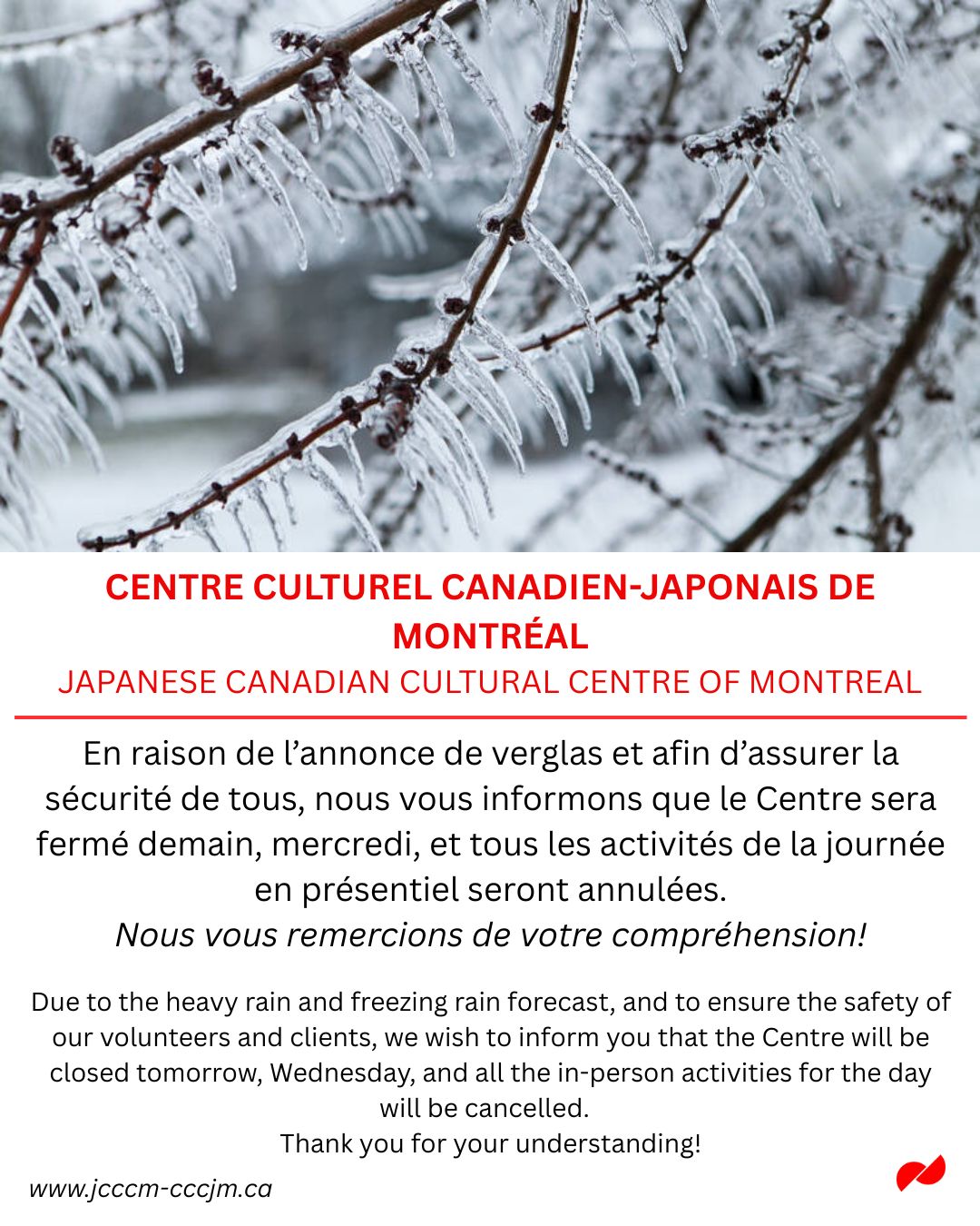 Due to the heavy rain and freezing rain forecast, and to ensure the safety of our volunteers and clients, we wish to inform you that the Centre will be closed tomorrow, Wednesday, and all the in-person activities for the day will be cancelled.